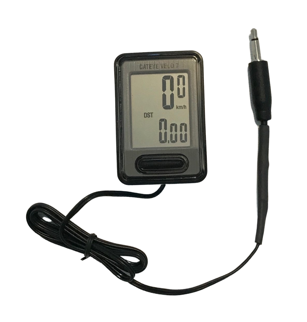 The display is a bicycle speedometer - one of two models: the Cateye Velo7, limited to a maximum speed of 125mph. We use bicycle speedometers because they give you the biggest bang for the buck: low cost, fast update rates, dual display of current speed along with your choice of max or average.